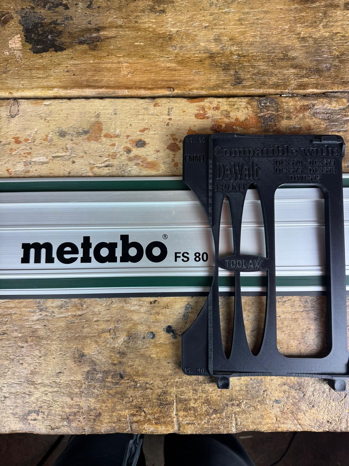 Turn your DeWalt circular saw into a track saw with this custom 3D-printed TOOLAX adapter base. Designed for smooth, straight, and splinter-free cuts, this adapter mounts easily to your saw and fits securely onto Metabo guide rails — no tools required.