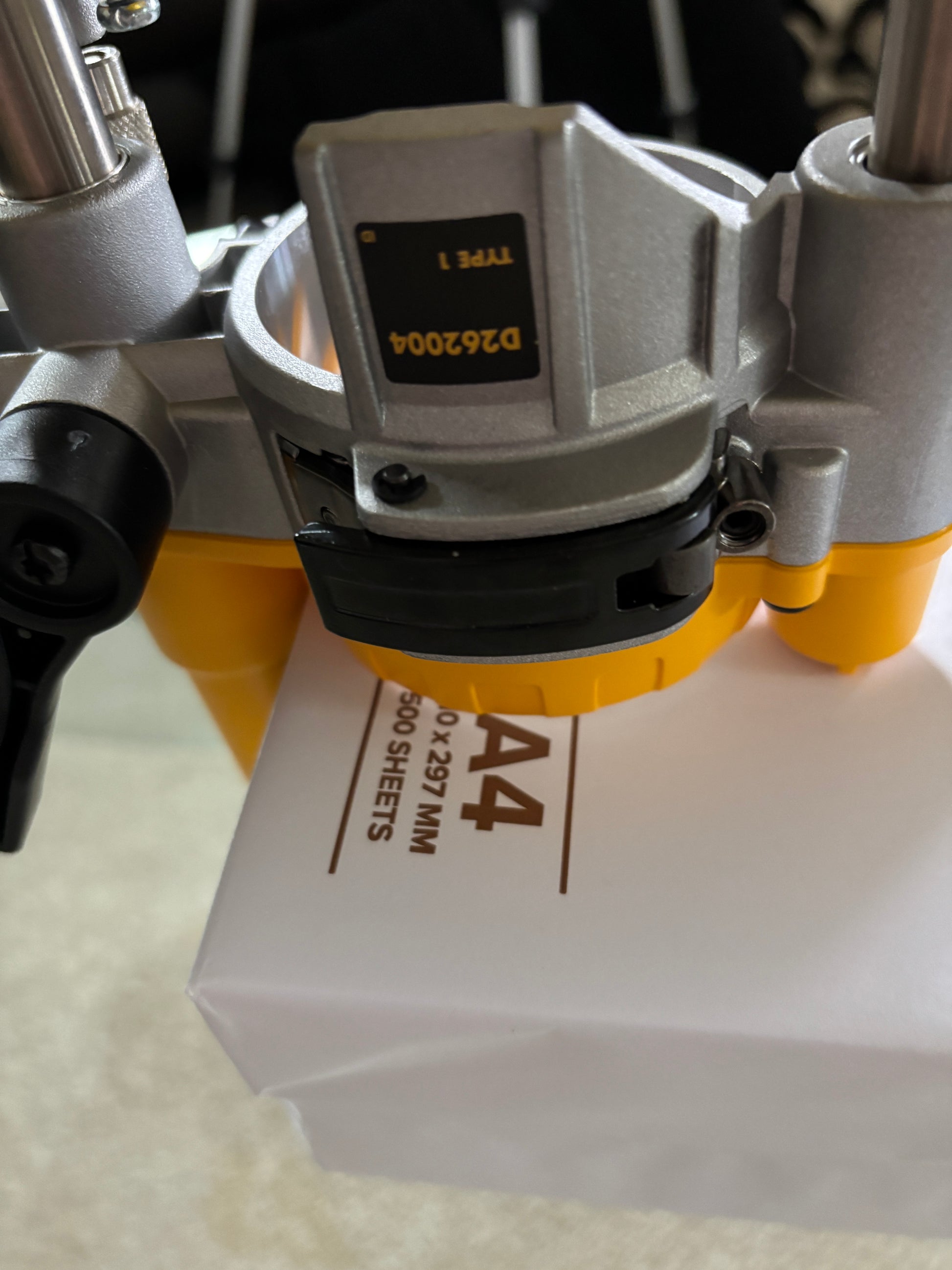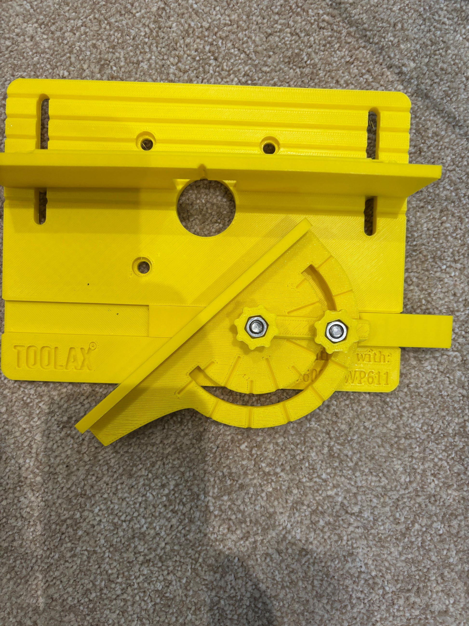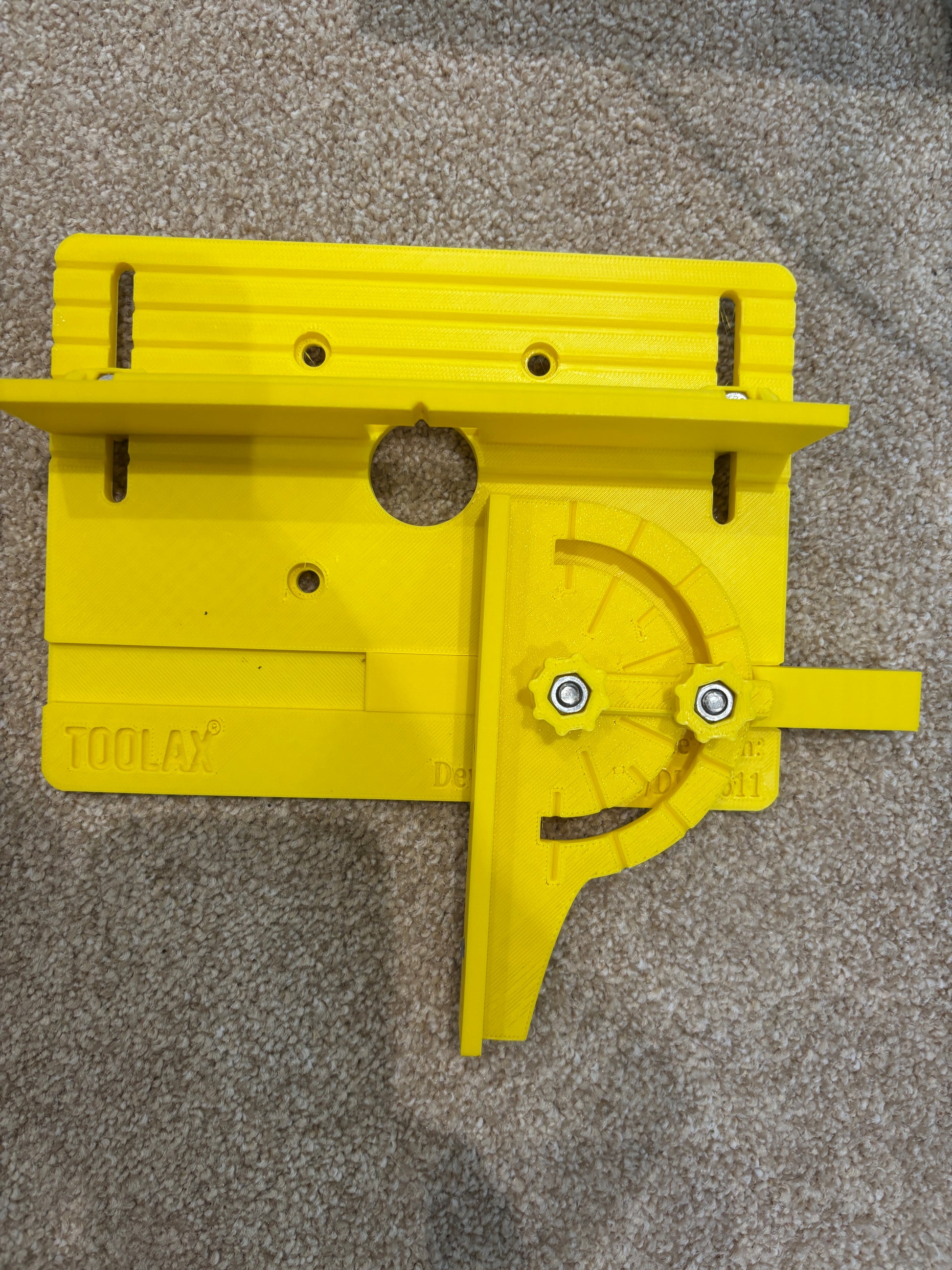 Mini Bench top router table for use with Dewalt 1/4" router (see above). Table size 210mm x 150mm Table thickness 7mm. Table aperture 34mm, back fence height 40mm, mitre fence height 20mm.